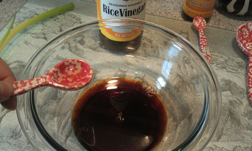 Start out by making the dipping sauce. To a small bowl stir together 1/2 cup soy sauce and 1 teaspoon rice vinegar.